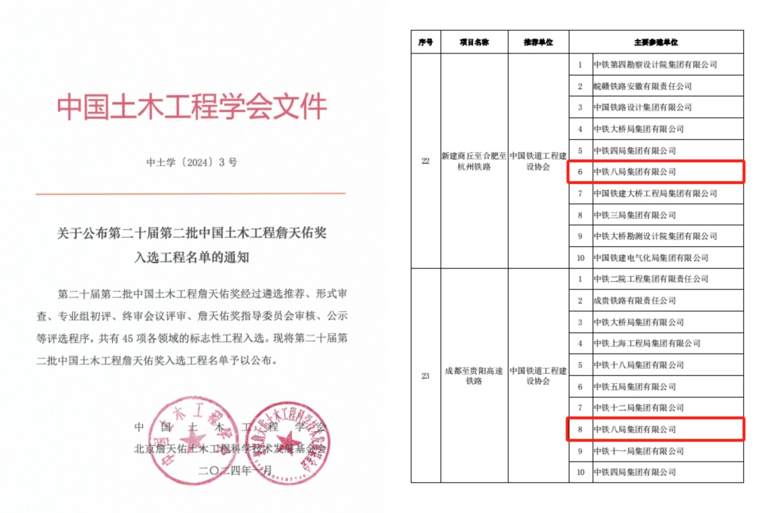 近日中国土木工程学会公布第二十届第二批中国土木工程詹天佑奖入选工程名单,中铁八局参建的商丘至合肥至杭州铁路和成都至贵阳高速铁路获此殊荣。至此,公司获得詹天佑奖总数增至3项。