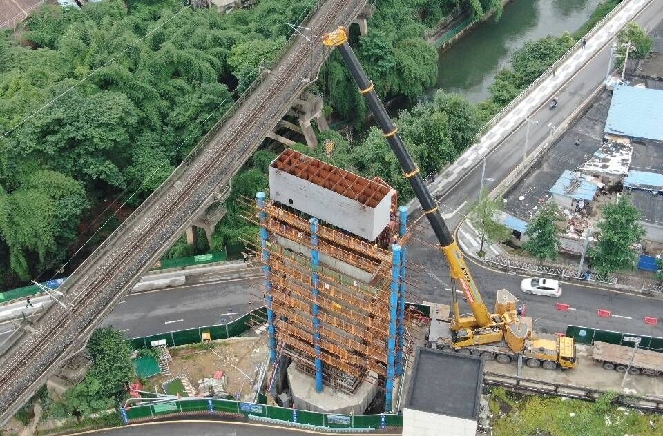 “该转体桥墩身采用钢筋混凝土花瓶墩,墩身高度为18.93米,上部转体段钢箱梁结构全长80米,采用分段拼装施工。”据项目负责人介绍,该桥转体重量达3782吨,为确保墩身与上部转体梁连接牢固可靠,钢筋混凝土墩身与墩顶钢箱梁之间采用钢混结合段设计,待墩顶钢箱梁节段吊装焊接到位后,还要再次浇筑混凝土完成钢混结合段施工,才能继续拼装其他节段箱梁,最后顺时针一次性转体70度后就位。本次墩身成功完成“带帽”作业,为下一步转体施工奠定了基础。