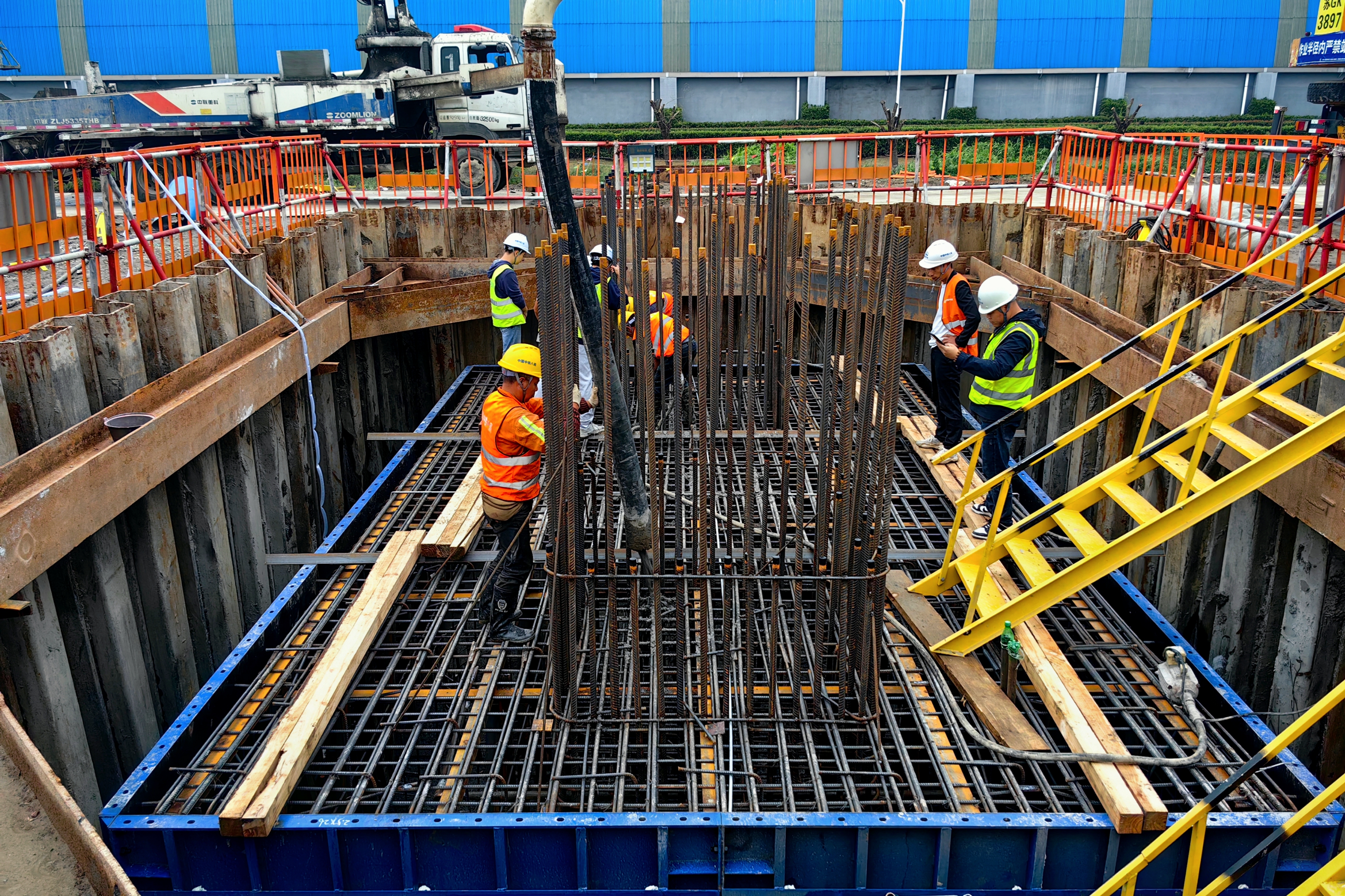 据项目负责人介绍,此次浇筑的承台为第一段高架主线桥Pm48#墩承台,长8.2米、宽5.2米、高2.5米,混凝土设计用量达106立方米,属大体积浇筑。施工前期,项目部积极践行“智慧工地”理念,充分利用迈达斯等计算软件进行角钢间距调整,并对劲性骨架合理优化,在进一步确保施工安全质量的同时,最大程度实现项目建设效率与效益的双重提升。
