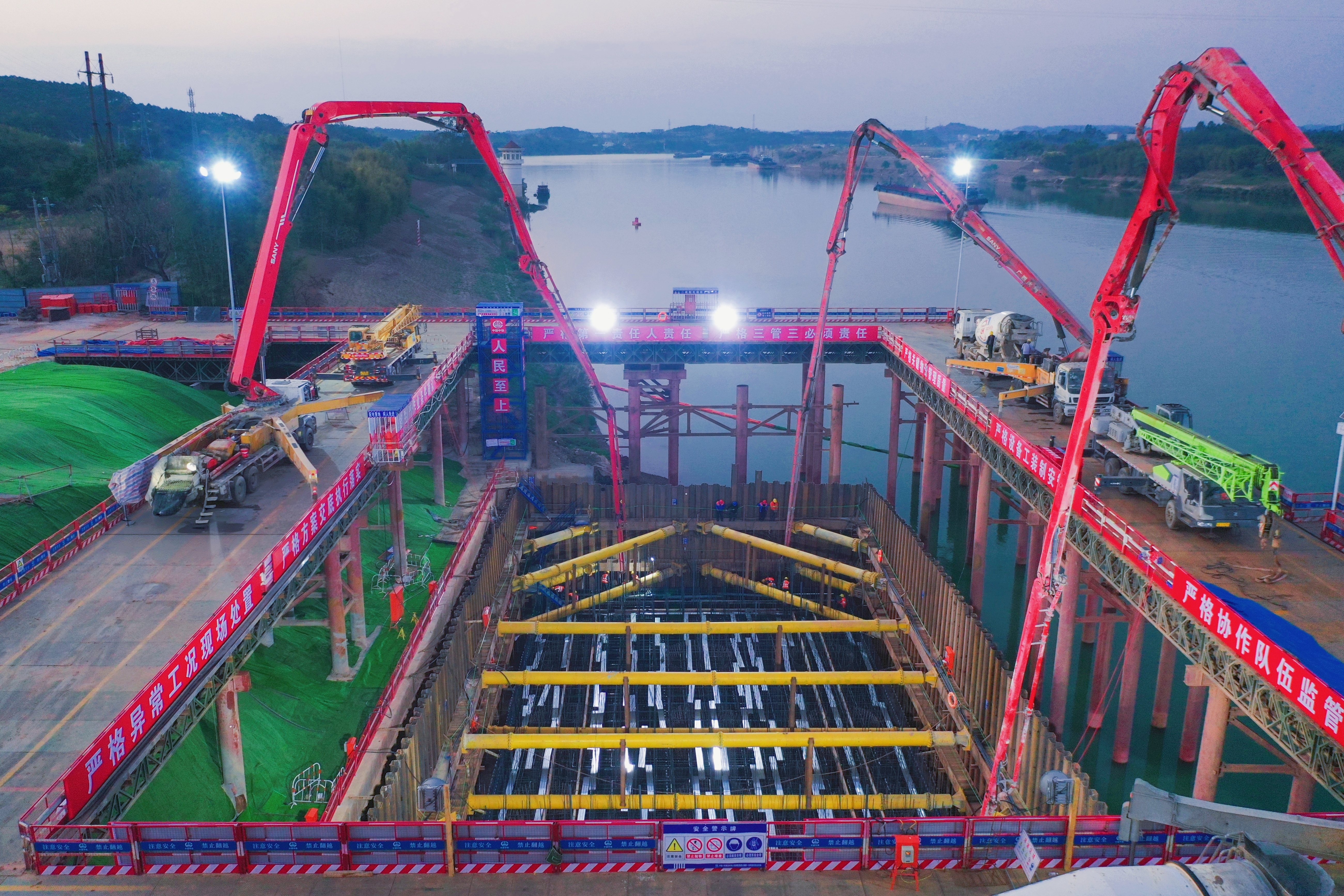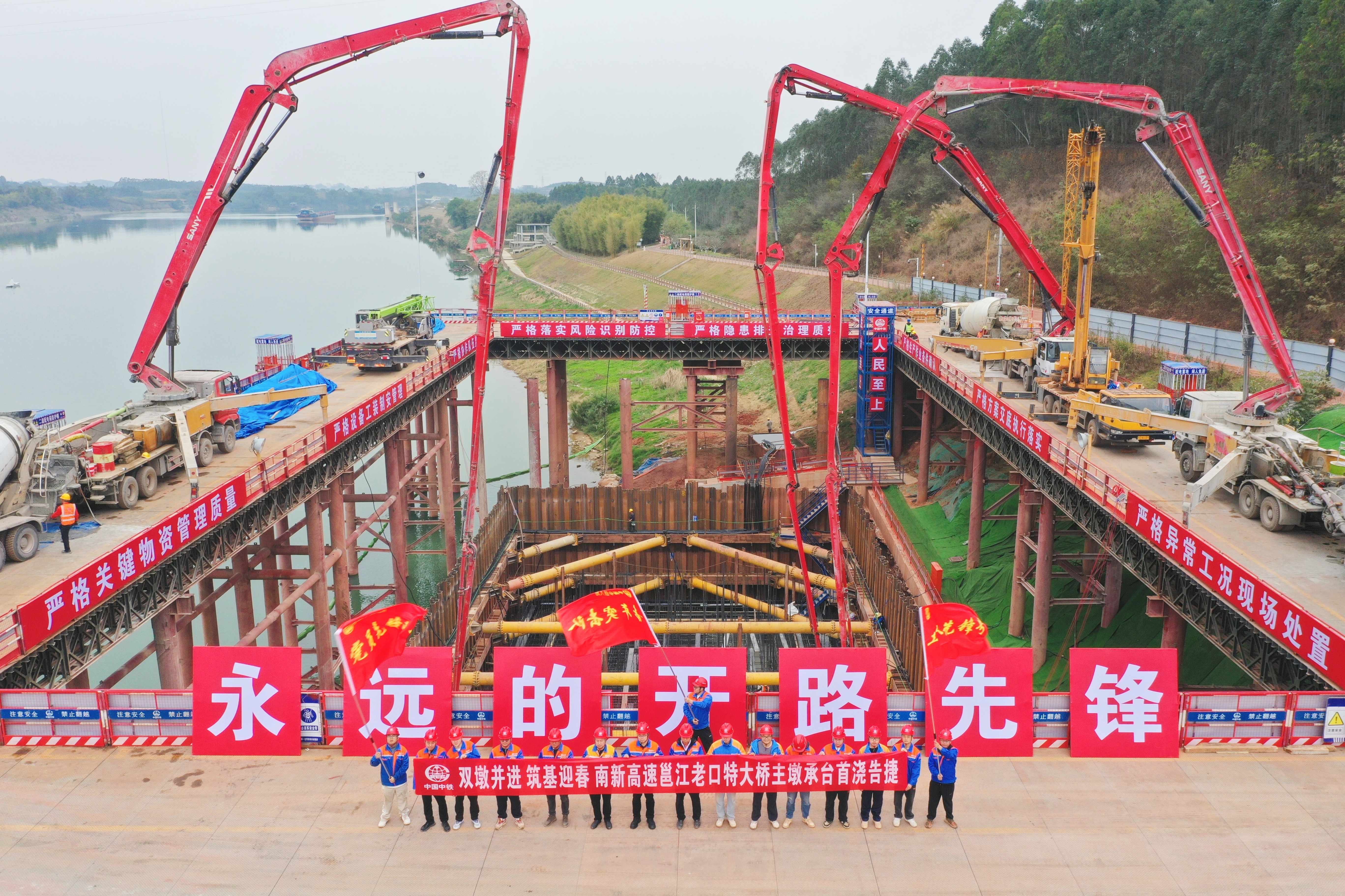 2月8日,南新高速公路关键控制性工程邕江老口特大桥两个主墩承台顺利完成首次浇筑,标志着大桥深水基础施工取得重大突破,为主塔“出水”奠定了坚实基础。