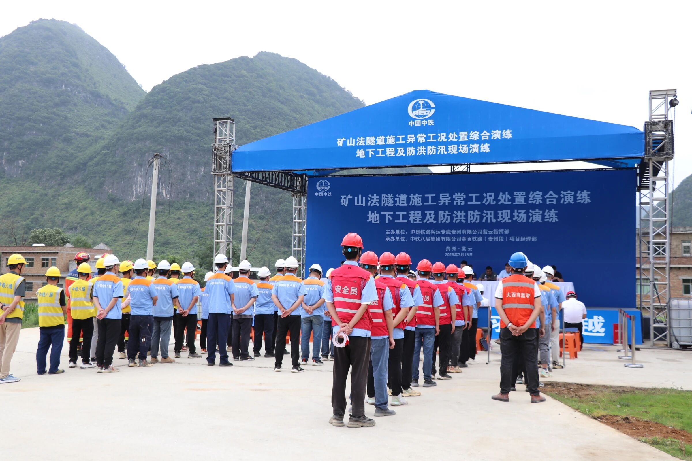 作为西部陆海新通道的重要组成部分,黄百铁路贵州段桥隧比高达81.6%,沿线喀斯特岩溶地貌发育,串珠型溶洞等地质难题交织,隧道开挖、高空作业等高风险工序密集,安全生产面临严峻考验。面对挑战,项目部坚持党建引领、党员示范、科技赋能“三管齐下”,推动专项行动走深走实,将安全责任转化为实实在在的工程屏障。