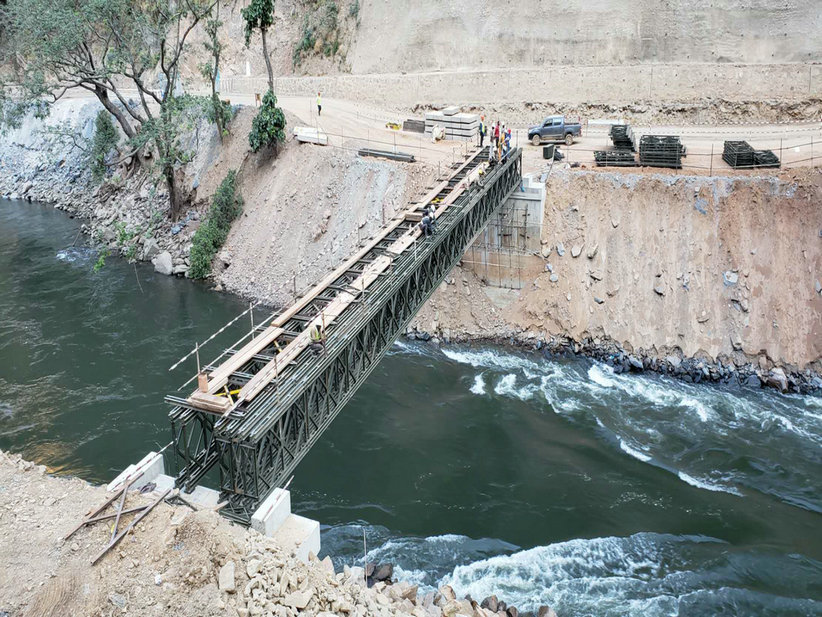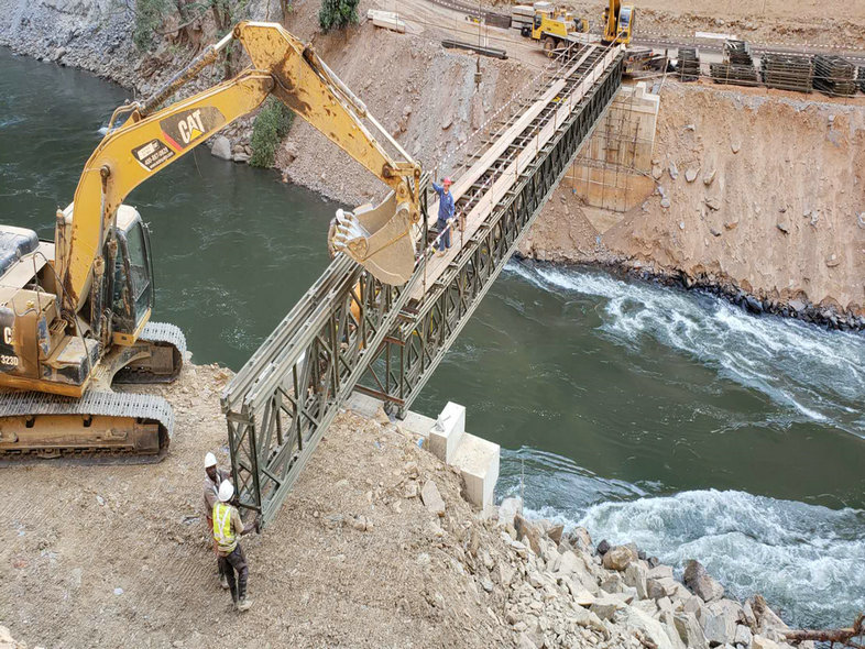 6月11日,由刚果(金)项目部负责施工的上坝公路左、右岸跨河贝雷桥顺利搭建完工,成功贯通了上坝公路左、右两岸交通要道。