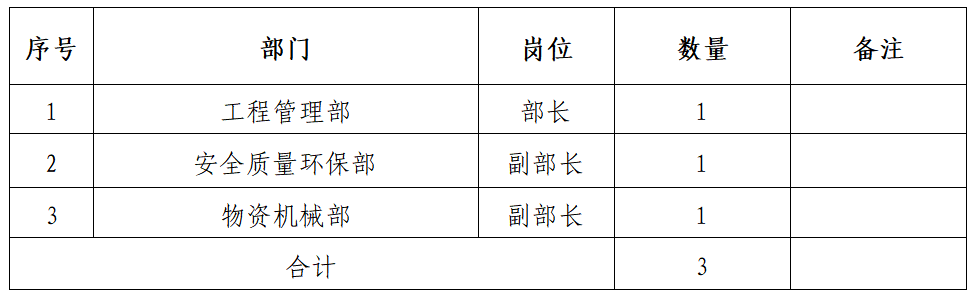 为落实三项制度改革和国企改革提升要求,进一步强化本部职能建设,根据集团公司中层管理人员选任指导意见、公司中层管理人员选任管理办法和内部岗位公开竞聘管理办法,现对公司工程管理部部长,安全质量环保部、物资机械部副部长岗位在全公司范围内进行公开竞聘,有关事项公告如下。