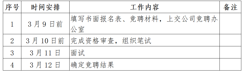 (一)本次竞聘工作在公司党委统一领导下组织实施。公司成立竞聘工作领导小组,具体负责竞聘工作的组织实施,行使竞聘岗位的确定、岗位竞聘人选的资格审查、竞聘岗位人选的最终确定等相关职责。