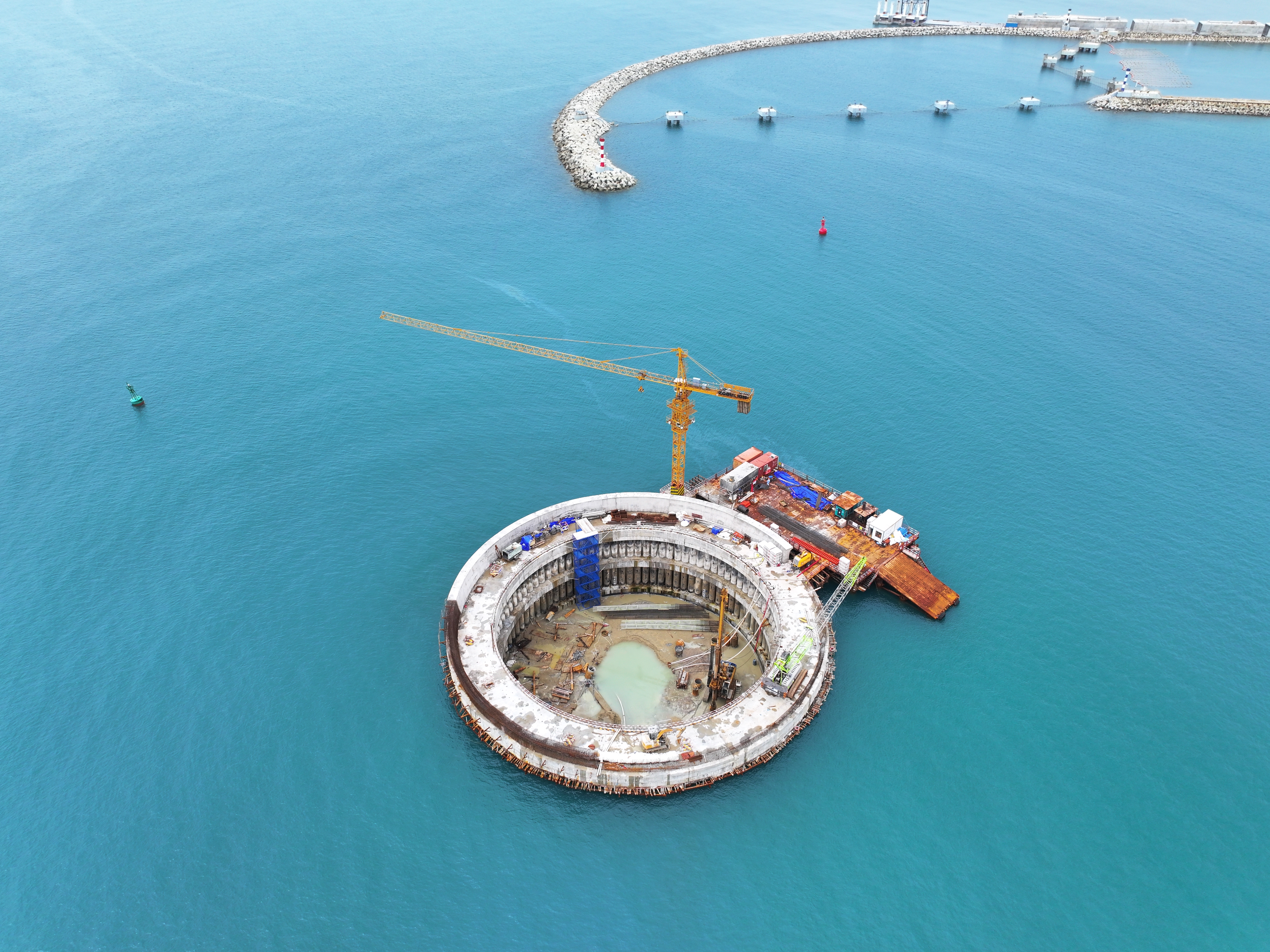 为此,施工过程中测量人员和技术人员全程对钢管桩围堰垂直度进行精确控制,利用全站仪实时监测并对钢管桩的垂直度进行纠偏,确保每根钢管桩的垂直度误差在2毫米以内。同时,为了避免转换井施工过程中产生的污废水对海域环境及珊瑚礁产生影响,项目部在围堰与外海侧及珊瑚礁之间设置一道防污帘,有效保护海洋生态环境。
