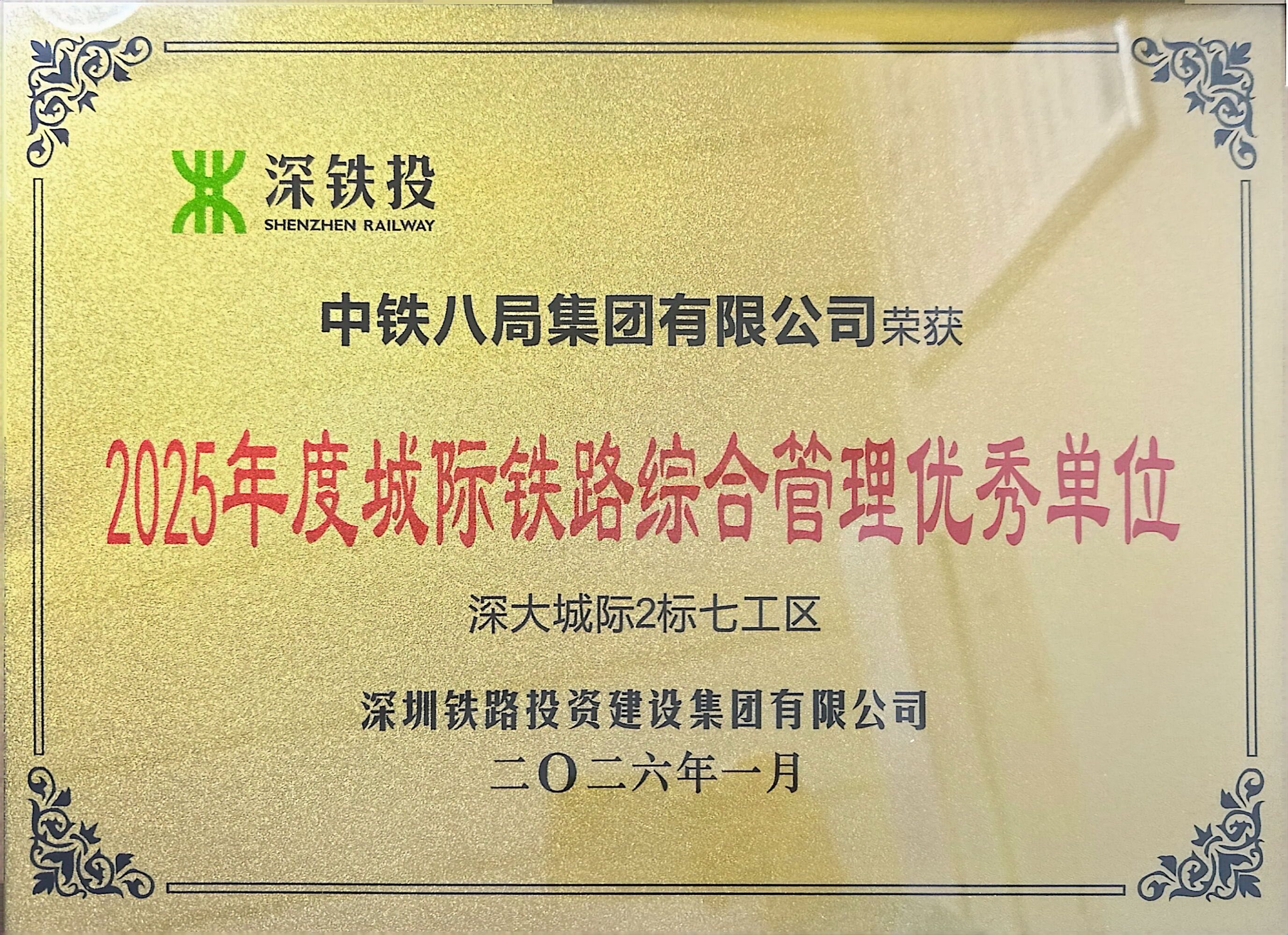 近日,从深大城际铁路建设指挥部传来喜讯,在2025年四季度及年度综合考评中,集团公司深大城际2标土建七工区项目部凭借卓越表现,从众多参建单位中脱颖而出,一举斩获季度和年度综合考评“双第一”的优异成绩,获得业主单位的高度认可和通报表扬。此前,在深圳铁路投资建设集团有限公司组织的2025年下半年参建单位履约评价中,该项目部从39家央国企建设单位中脱颖而出,同样位列A类第一名,并荣获“综合管理优秀单位”和“安全质量管理优秀单位”称号,实现了荣誉“大满贯”。